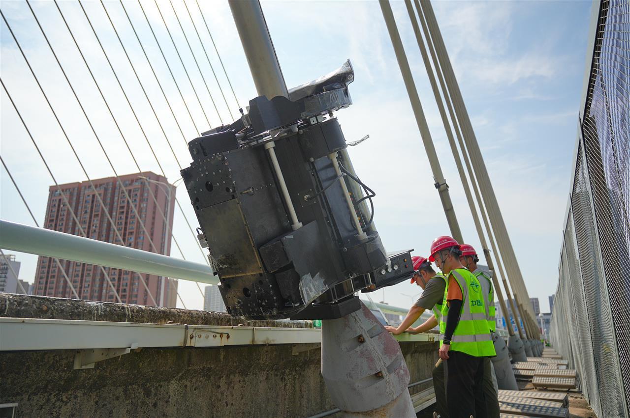 本次年度定检综合运用多样化的检验测试手段,通过多功能路况车、SFC横向力系数车等高效普查路面状况,借助无人机对大型桥梁进行空中巡检,并综合运用桥检车、无线云台摄像杆、皮划艇等设备对关键部位进行“抵近式”勘查;运用图像综合测量系统、无人机智能检测系统等对难抵近部位进行“智能化”检测;运用拉索智能检测机器人对高空索杆进行“自动化”检测。
